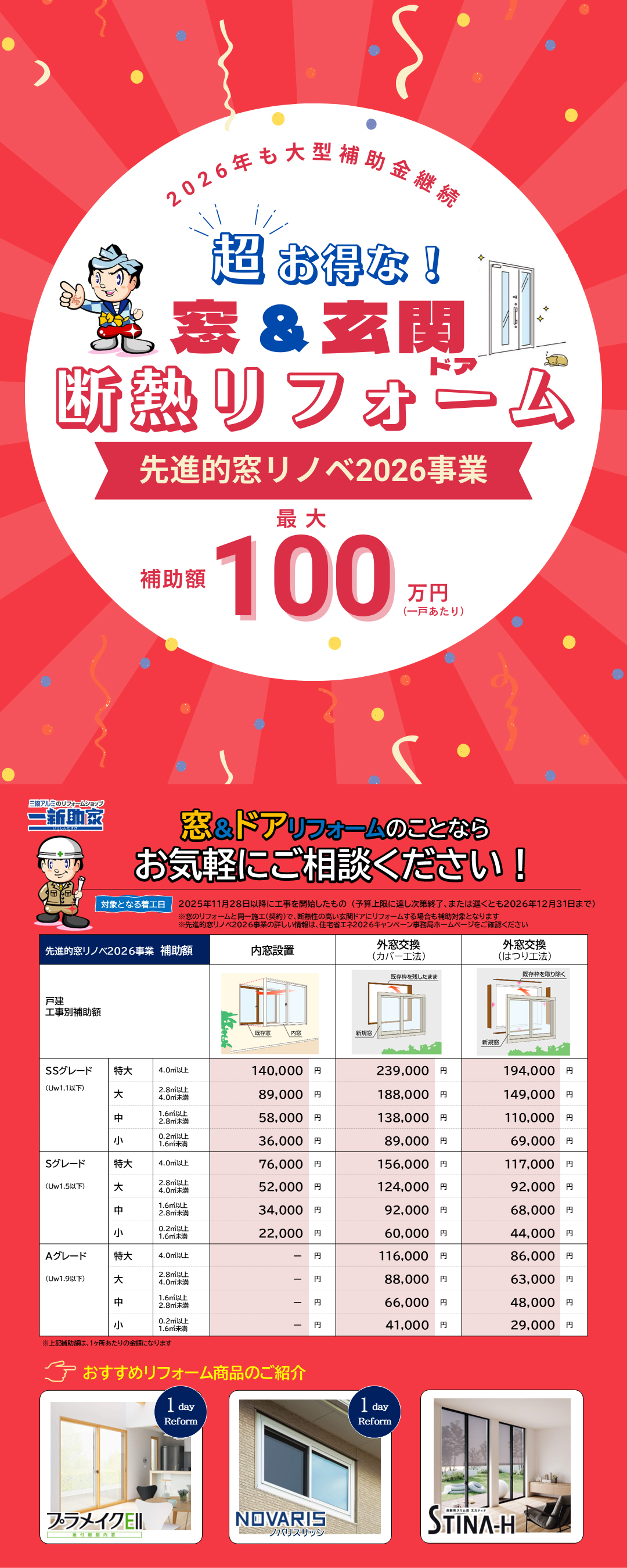 「一新助家」店で契約し「三協アルミ」「タカラスタンダード」の商品を使用した物件の施工事例を大募集しております。詳しくは下記チラシをご覧ください。